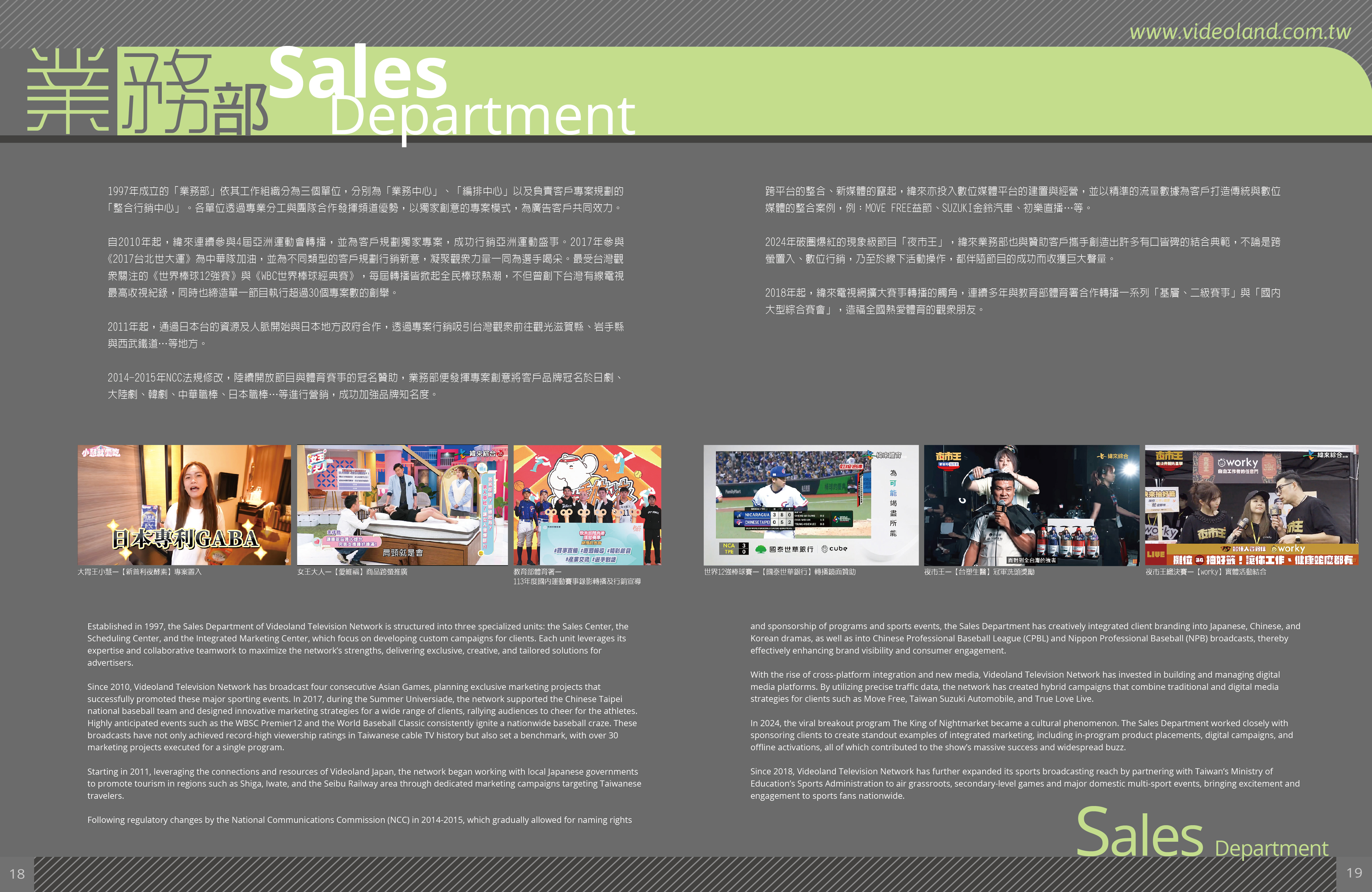 1997年成立的「業務部」依其工作組織分為三個單位,分別為「業務中心」、「編排中心」以及負責客戶專案規劃的「整合行銷中心」。各單位透過專業分工與團隊合作發揮頻道優勢,以獨家創意的專案模式,為廣告客戶共同效力。自2010年起,緯來連續參與4屆亞洲運動會轉播,並為客戶規劃獨家專案,成功行銷亞洲運動盛事。2017年參與《2017台北世大運》為中華隊加油...