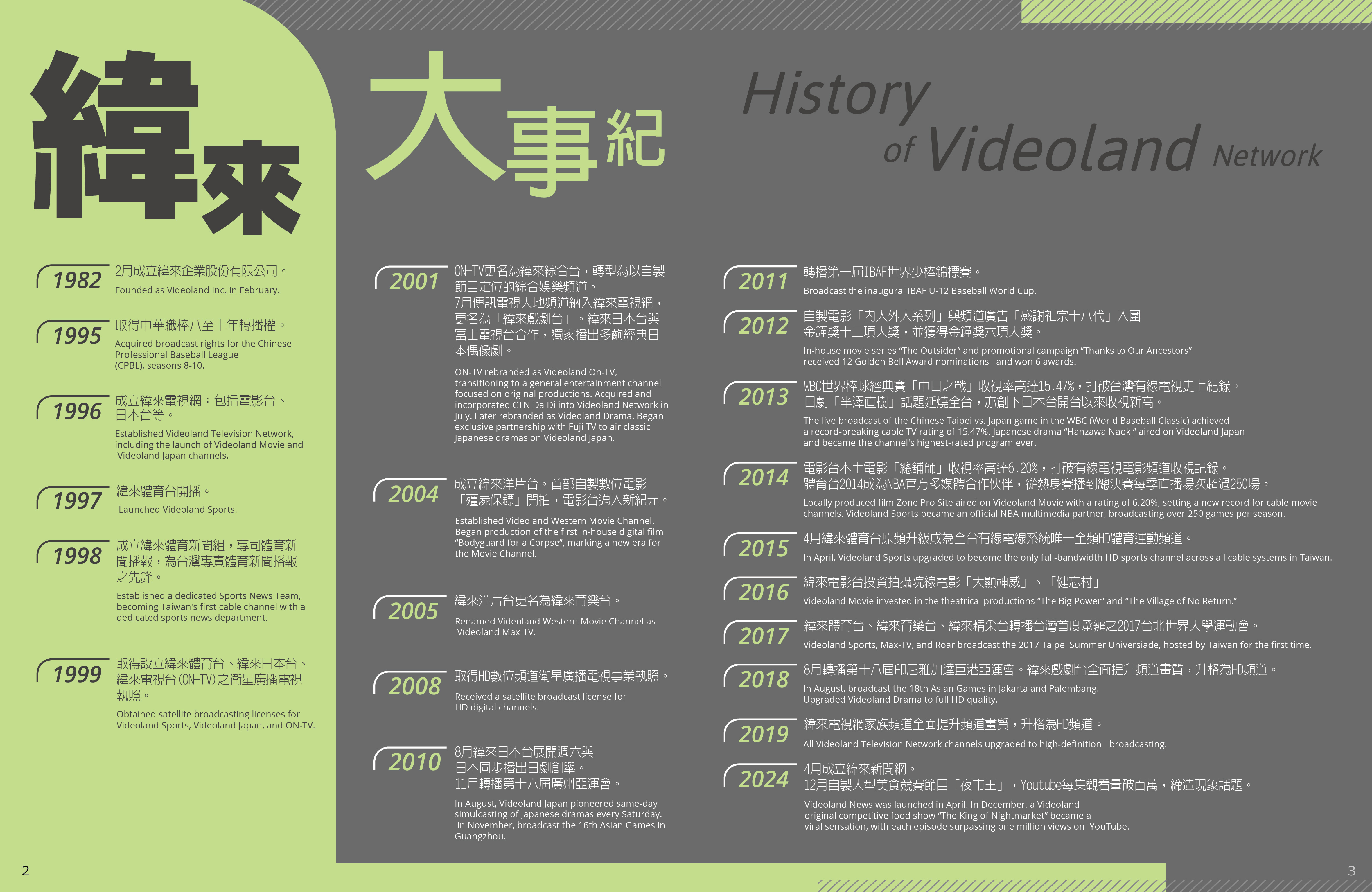 1982-2月成立緯來企業股份有限公司。1995-取得中華職棒八至十年轉播權。1996-成立緯來電視網:包括電影台、日本台等。1997-緯來體育台開播。1998-成立緯來體育新聞組,專司體育新聞播報,為國內專責體育新聞播報之先鋒。1999-取得新聞局許可設立緯來體育台、緯來日本台、緯來電視台(ON-TV)之衛星廣播電視執照...